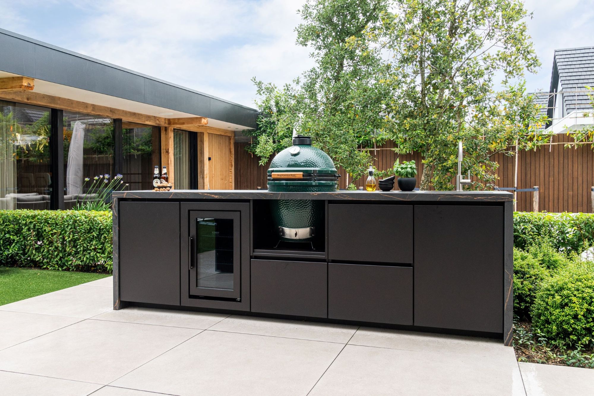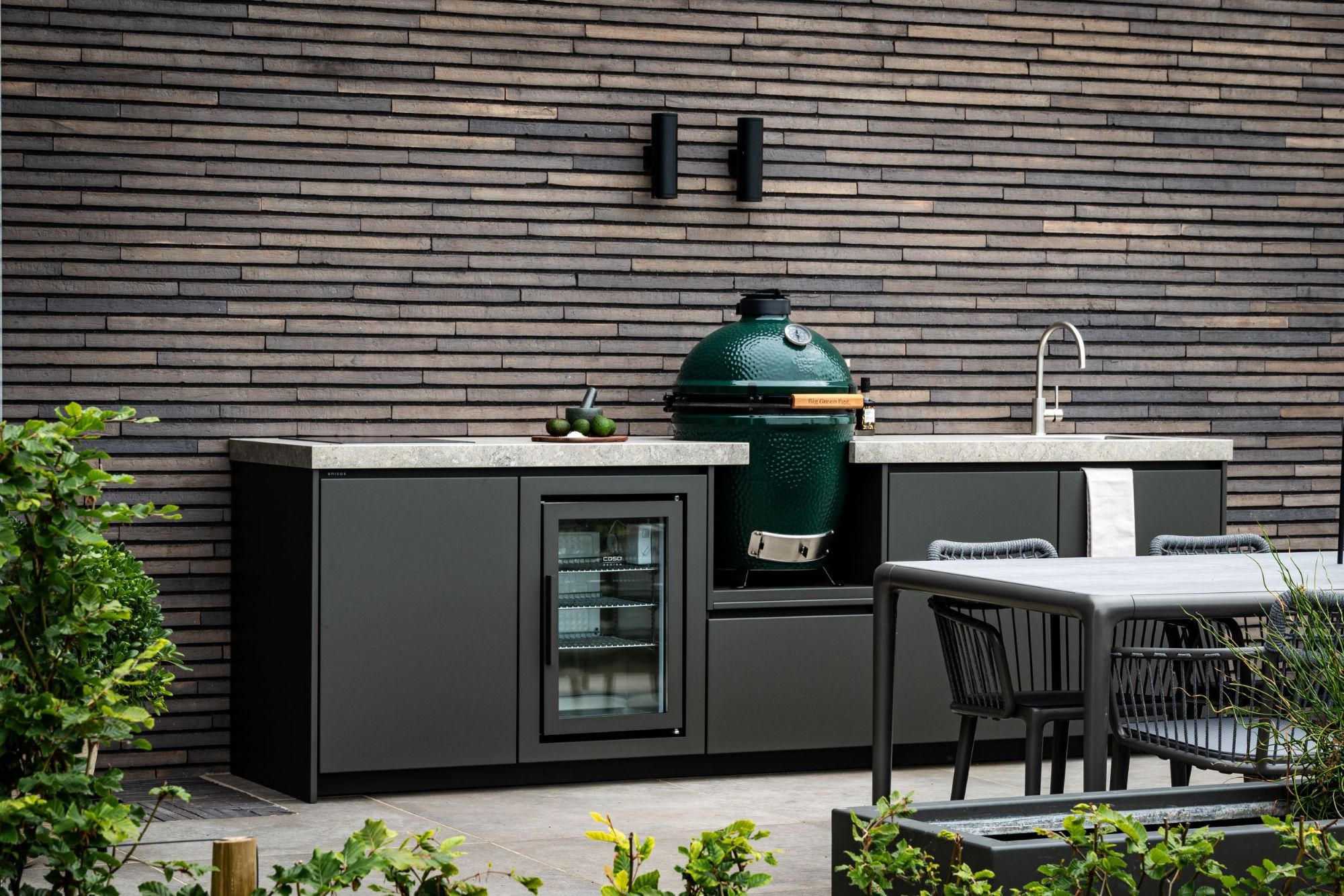 Binnen de heldere kaders van de overkapping vormt de buitenkeuken van Unicos het sociale middelpunt van de tuin. Unicos ontwerpt en bouwt maatwerk buitenkeukens waarbij esthetiek en techniek op het allerhoogste niveau samenkomen. In dit segment volstaan standaardoplossingen niet; hier draait het om onverwoestbaar aluminium in combinatie met werkbladen van keramiek of Dekton. Deze materialen zijn niet alleen gekozen vanwege hun duurzaamheid en hittebestendigheid, maar ook vanwege hun tactiele waarde en luxe uitstraling. De naadloze integratie van high-end apparatuur, zoals een Big Green Egg, professionele gaspitten of een geïntegreerde koeling, maakt van de tuin een volwaardige culinaire werkplek. Het is de balans tussen de strakke, verticale profielen van Linizio en de solide, horizontale lijnen van de Unicos-keukens die zorgt voor een visuele rust die kenmerkend is voor high-end design.