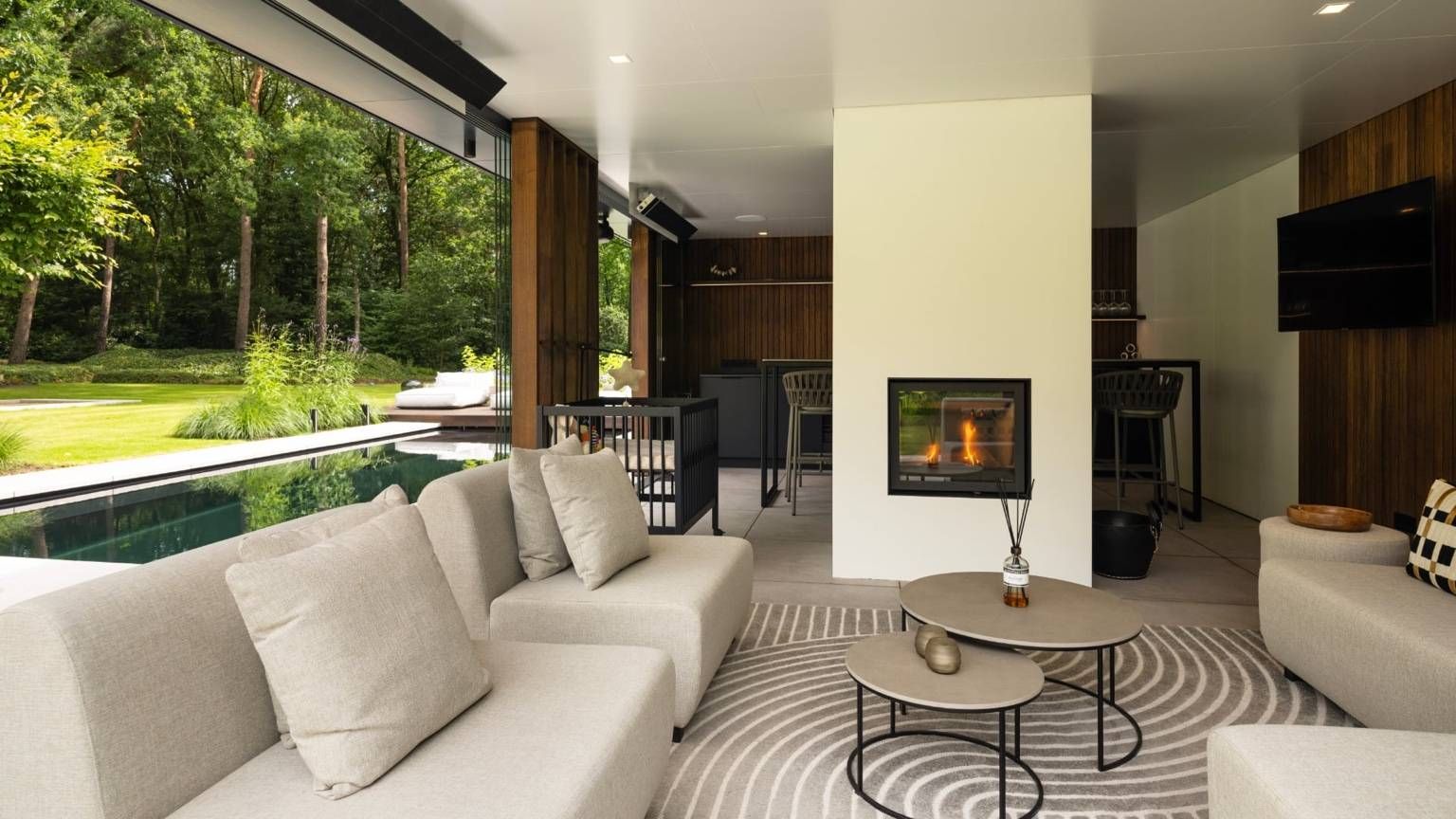 - Luxe Poolhouse: Een bar en haard voor lange avonden buiten.