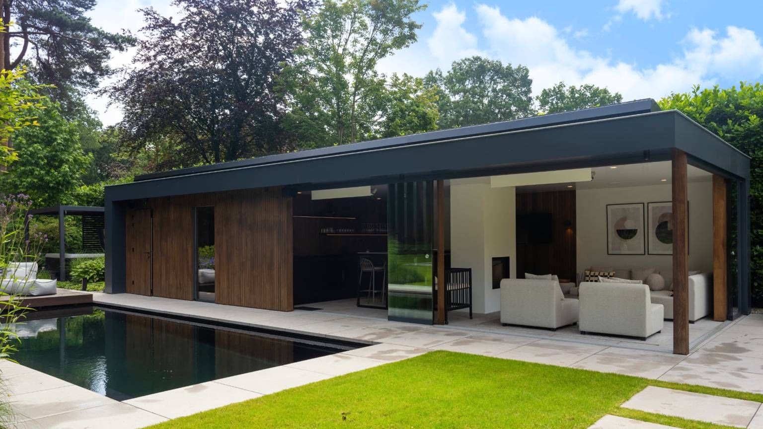 Het poolhouse is hier geen bijgebouw, maar een volwaardig buitenverblijf. Door gebruik te maken van natuurlijke materialen en strakke lijnen vormt het de brug tussen de witte villa en het robuuste bos. Binnenin vloeien de functies in elkaar over: van de hitte in de sauna naar de ontspanning aan de bar, met altijd zicht op het weerspiegelende water en de jeu de boulesbaan.
