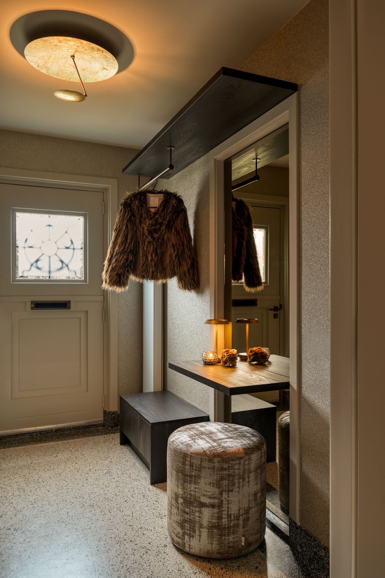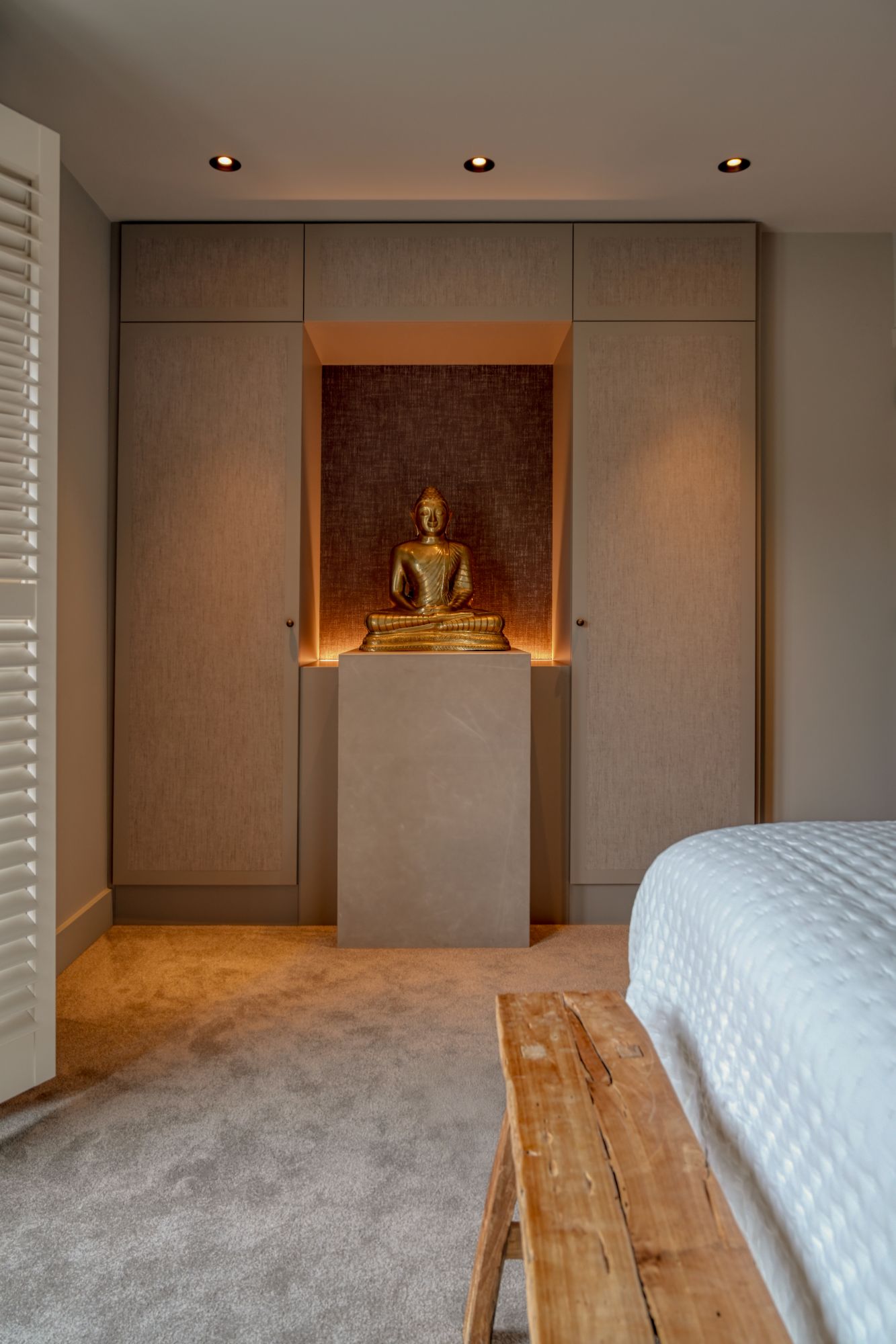 In de master bedroom en entreehal is ook maatwerk toegepast om een serene en harmonieuze sfeer te creëren. In de garderobekast is een subtiel vormgegeven zuil geïntegreerd waarop een Boeddhabeeld een bijzondere plek heeft gekregen. Dit element fungeert als een rustig, bijna sculpturaal accent binnen het ontwerp en versterkt de kalme, persoonlijke uitstraling van de ruimte.