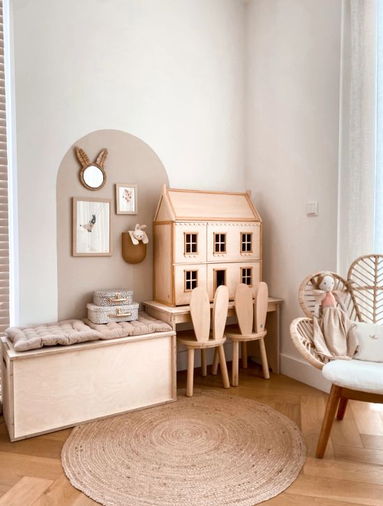De basis voor een rustig beeld is consistentie. Om de speelhoek te laten versmelten met de rest van de ruimte, trek je de materialen van je interieur door naar de kinderzone.