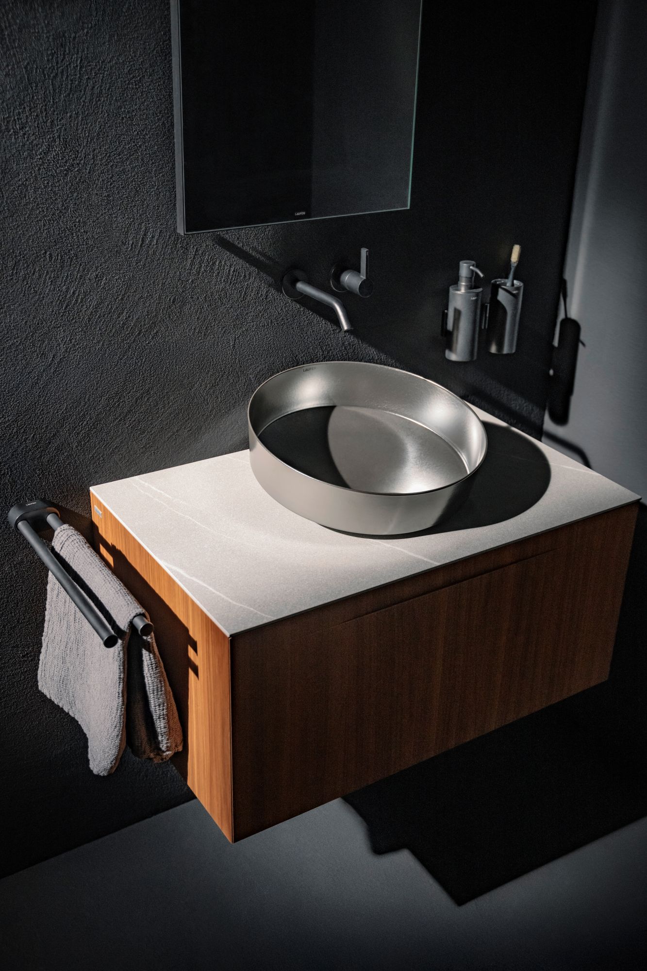 Matte en glanzende zones ontmoeten elkaar, waardoor de overgang tussen de materialen zelf een statement wordt: licht 'leest' de oppervlakken anders, wat visuele diepte creëert. Drie kleurencombinaties – Tuscany, Petrol en Olive – maken de wastafel tot het middelpunt van de ruimte.