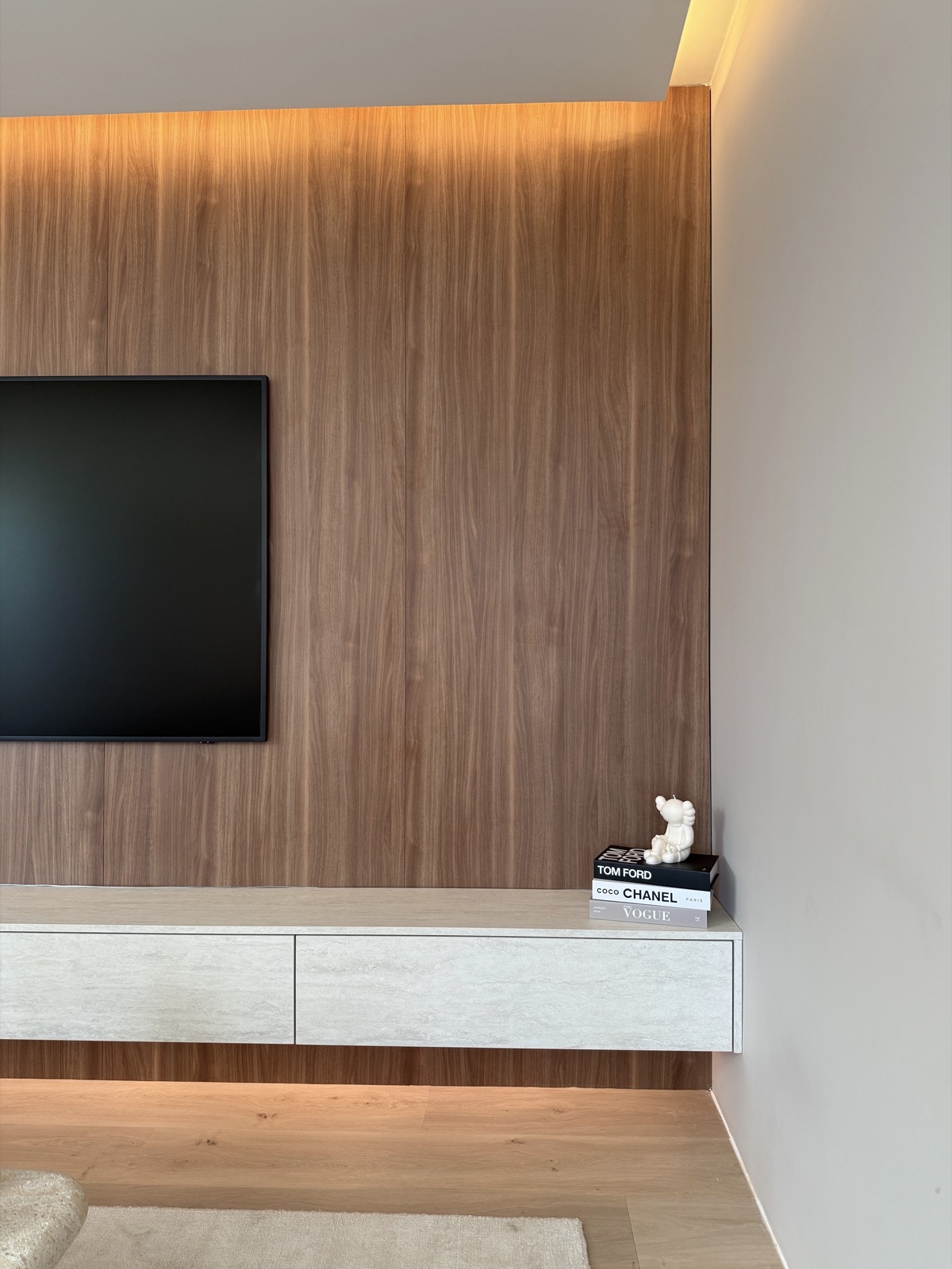 Maatwerk speelt een centrale rol in dit project. Zowel in de woonkamer als in de badkamer is gekozen voor op maat gemaakte oplossingen die niet alleen de beschikbare ruimte optimaal benutten, maar ook bijdragen aan de visuele rust. Kastwanden, nissen en het douchescherm zorgen door de kleinste details ervoor dat alles naadloos op elkaar aansluit.