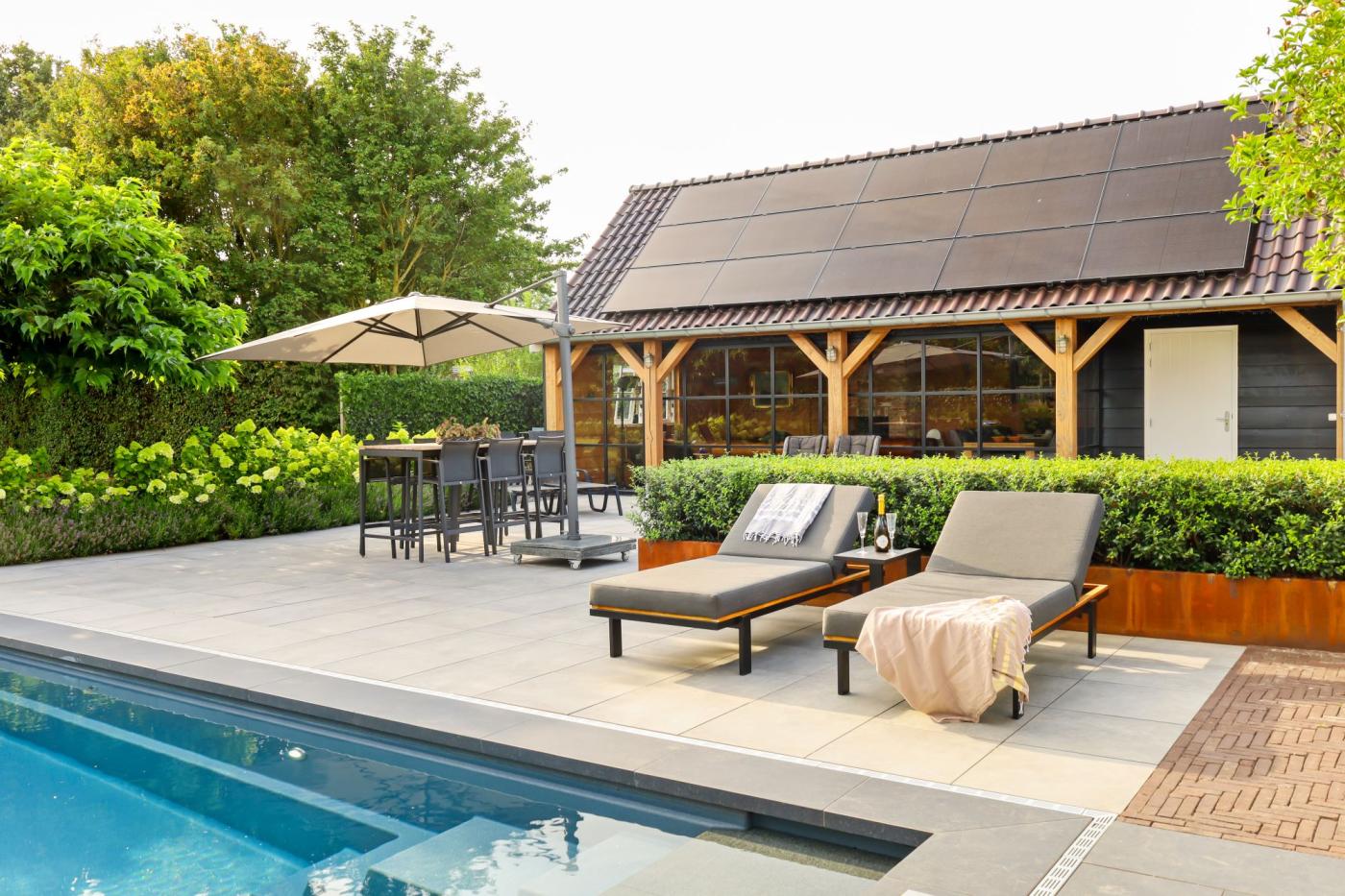 Een eindeloos uitzicht vanuit het zwembad en toch alle privacy die men wensen kan. Een idealistisch beeld voor velen van ons. Een tuin die op het zuiden rust met veel privacy. Heerlijk genieten in de tuin van de ondergaande zon en een glas wijn. Het kan slechter. De zichtlijn wordt versterkt door de Moerbeibomen in ritme geplaatst in het gazon. Dit in combinatie met een prachtig eiken bijgebouw en een zon overgoten terras geven het gevoel van altijd vakantie. Het zwembad wordt omarmd door cortenstalen bakken beplant met Osmanthus Burkwoodi. De lavendel en de Hydrangea paniculata zorgen voor kleur en geur en complimenteren het geheel.