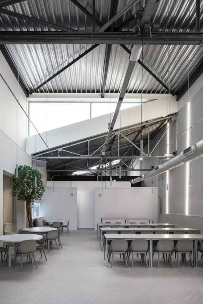 Het restaurant is gesitueerd in de tweede voormalige fabriekshal – een hoge ruimte met een schuin dak. De industriële stalen spanten vormden het startpunt van de ruimte. De hele ruimte is ontworpen met verschillende materialen en texturen – allen in een frisse, lichtgrijze kleur. Het houten visgraatmotief van de receptie en ‘Factory 1’ loopt hier door, maar is uitgevoerd in lichtgrijs natuursteen. De betonnen bar en uitgifte meubels zijn als massieve blokken tegen de wanden gepositioneerd. Om de akoestiek te verbeteren, zijn de naastgelegen vergaderruimtes volledig afgewerkt met een verticaal patroon van houten latten.