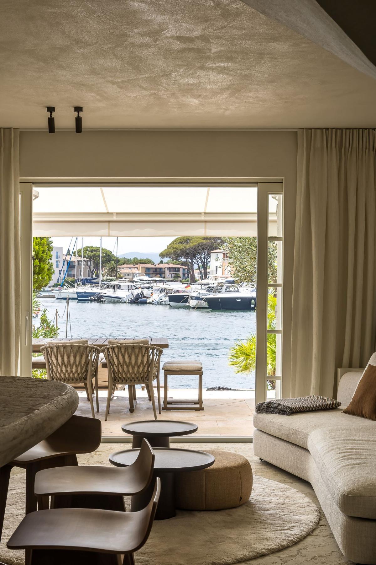 • Lichte tinten om sereniteit te behouden, afgewisseld met warme materialen zoals hout en details in brons