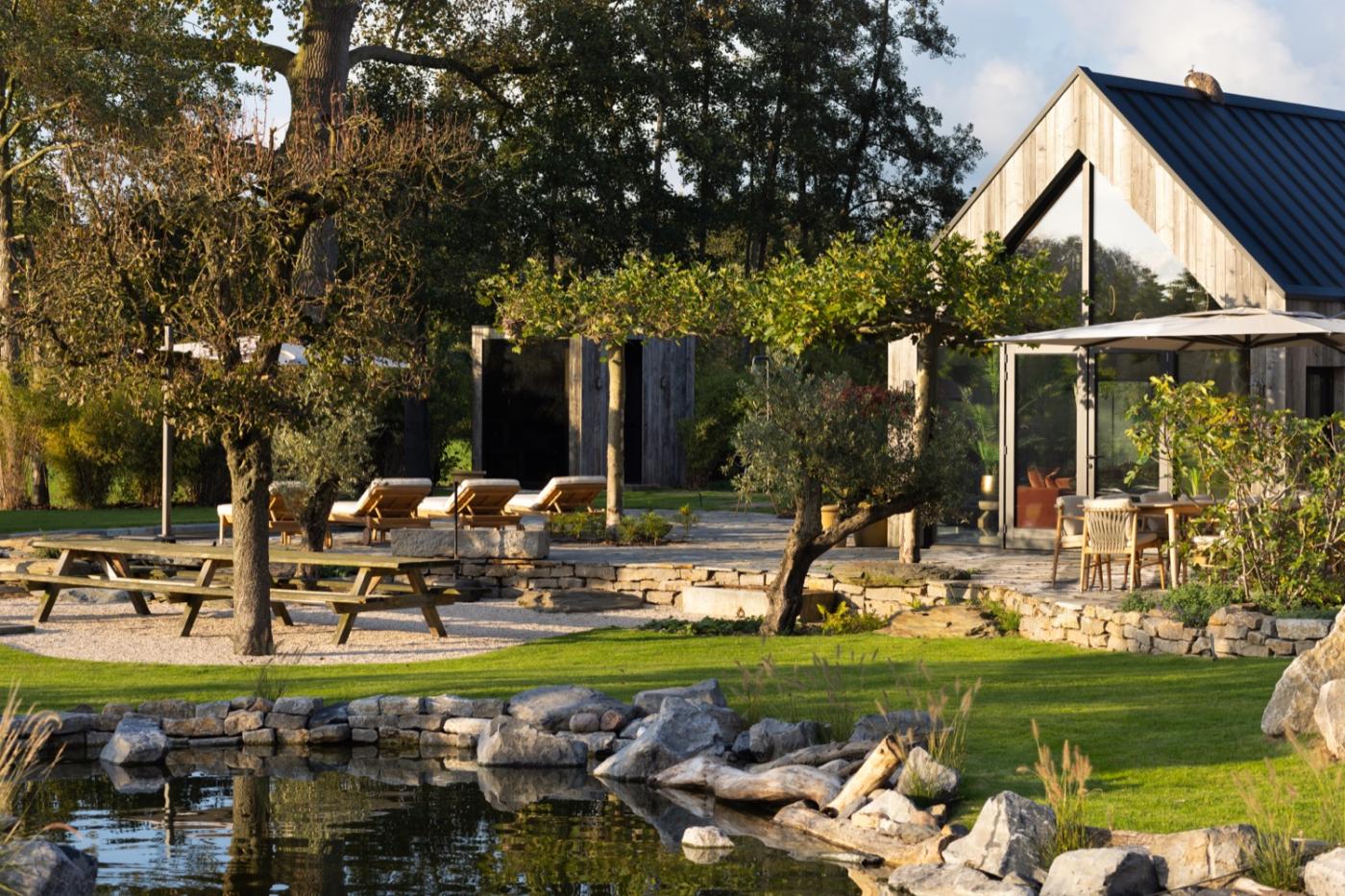 De vijver, omringd door ruige rotsen, voegt een bijna wilde sfeer toe. Rondom het zwembad heerst een ontspannen Zuid-Franse ambiance, met agstones en comfortabele ligbedden die uitnodigen tot ontspanning. De sauna op het erf, geeft op zijn beurt een Scandinavische woonbeleving. Deze woning vormt dus van buiten een spannend en eclectisch kunstwerk. Zodra de dertig bomen worden aangeplant en de laatste details – waaronder een op maat gemaakte tent boven de vuurkorf – op hun plek staan, wordt deze tuin het ware paradijs voor Bas en zijn vrouw Christel. Voor de meeste mensen dit nú al een waanzinnig beeld, maar de kritische tuinondernemer Bas blijft scherp: “De tuin is nog een work in progress. Kom maar weer langs als het af is, dan weet je niet wat je ziet.” Ondanks zijn ‘drive’ en oog voor detail heeft Bas het talent om ook van het moment te genieten: “Als ik na een lange werkdag de eendjes zie lopen en onze schildpadden zie kruipen, en zie hoe ons huis blendt met de natuur, ben ik intens gelukkig,” vertelt hij met een glimlach.
