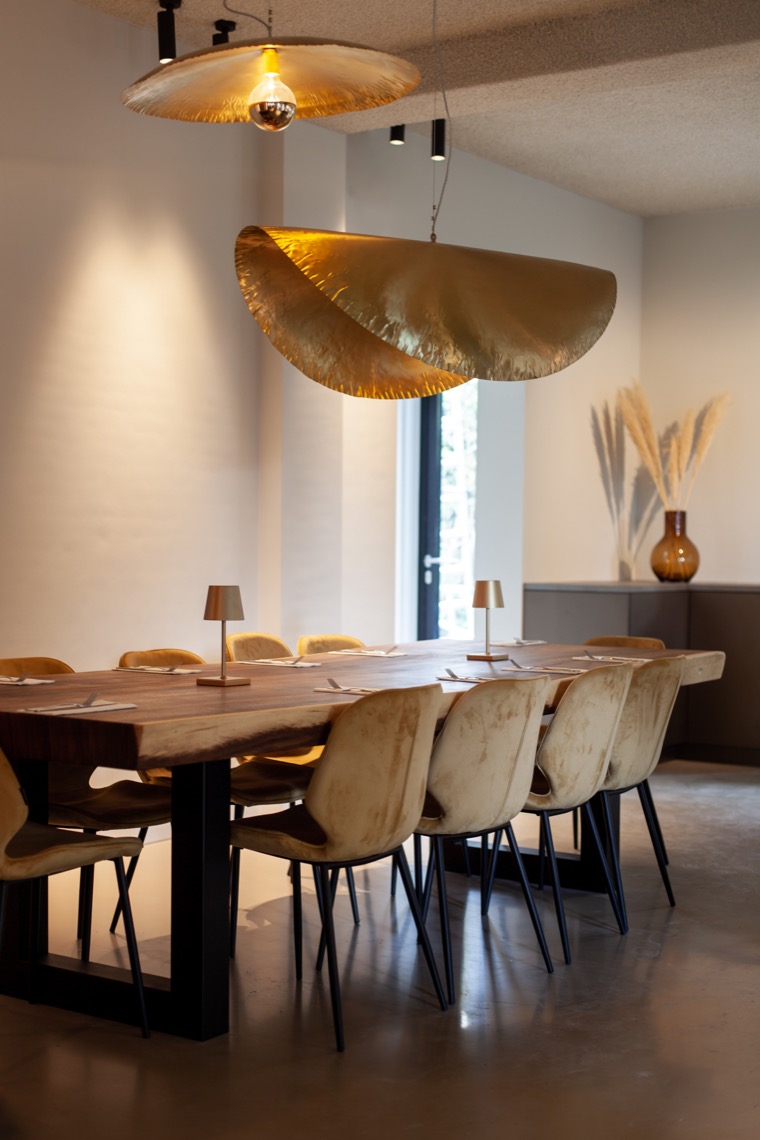 De ruime, gastvrije bar vormt het middelpunt van het restaurant. Aangepaste kasten achter de bar en doordachte verticale verlichting creëren een speels, herhalend patroon dat de voor- en achterkant van het restaurant met elkaar verbindt. Bij het ontwerp stond een vlotte en logische indeling centraal, zowel binnen als op het terras. Een zorgvuldig lichtplan werd ontwikkeld, waarbij functionele en sfeervolle verlichting in harmonie samengingen. De grote ronde lampen zijn een subtiele verwijzing naar het hoofdconcept van het restaurant: pannenkoeken