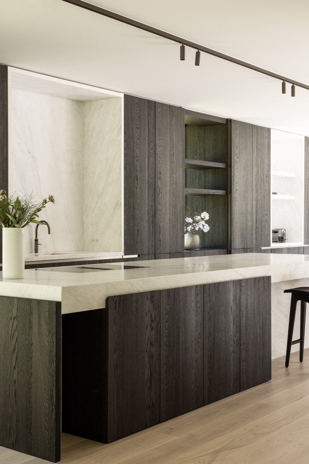 De villa werd verder aangevuld met een paviljoen dat op een zwevend plateau ruimte biedt aan de keuken. Het strakke design van de architecturale uitbreiding blendt perfect met de landelijke architectuur dankzij de gevelbekleding met zwarte afrormosia beplanking. Verder loopt het nieuwe volume aan de achterzijde van de woning over in een overdekt terras met ingebouwde barbecue. In lijn met de signatuur van Mieke Van Herck architecten is het uitzicht op de buitenomgeving alom aanwezig en altijd dichtbij. Een inventief detail dat deze buitengewone synergie mooi illustreert, is een van de vensters in de keuken. Dat raam loopt door van plafond tot vloer en wordt binnen geflankeerd door een maatkast met insnedes, zodat het daglicht en de groene omgeving het geborgen interieur op een subtiele manier kunnen bereiken.