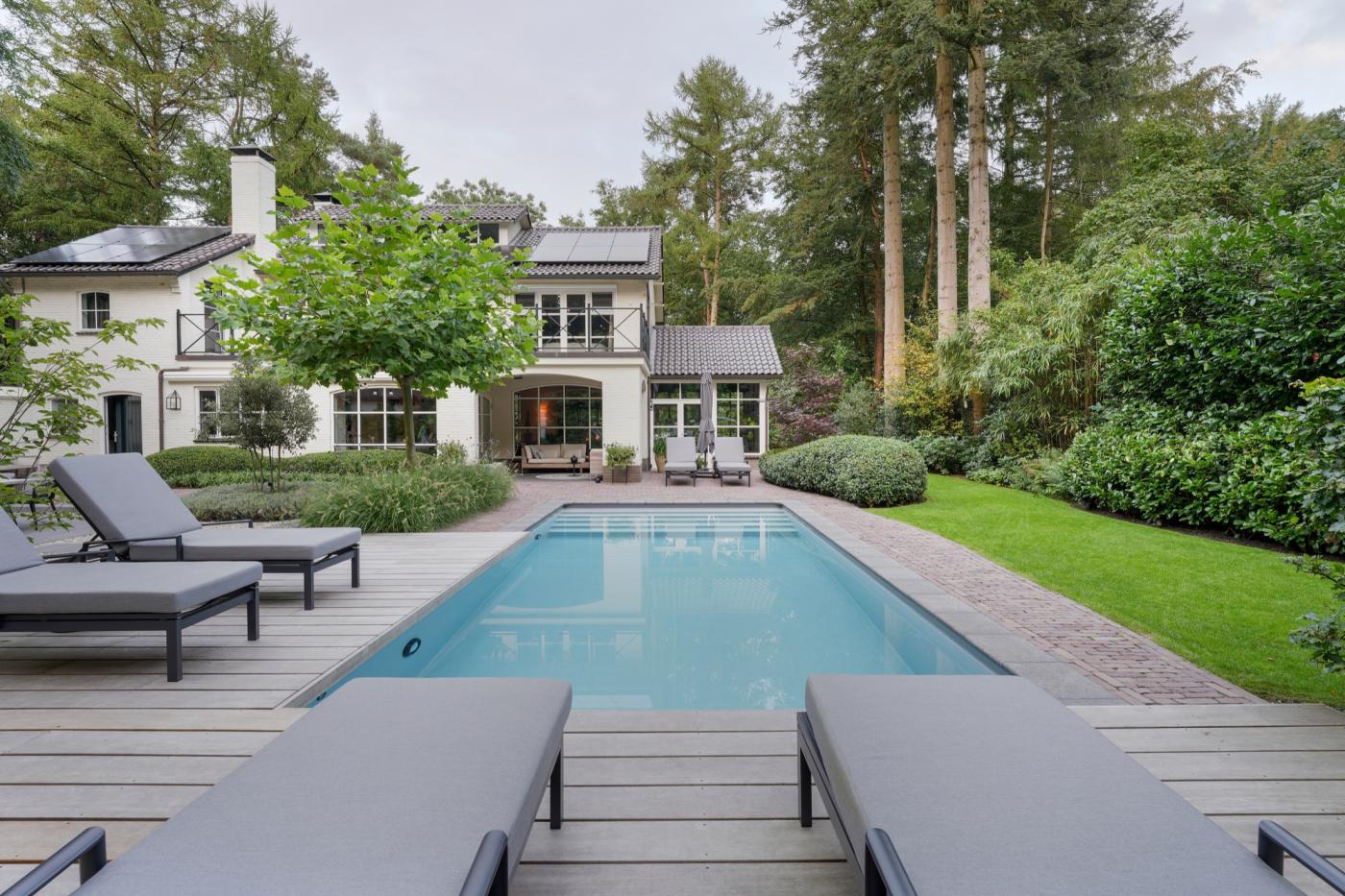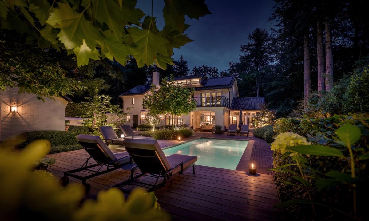 Midden in de bossen op de Veluwe staat deze prachtige licht-klassieke woning. De grote wens van de bewoners was een tuin, waarin het zwembad tot zijn recht komt en waar verschillende plekken zijn om te zitten. Verder was een naadloze aansluiting om de omgeving gewenst, met hergebruik van de reeds aanwezige klassieke oud gebakken waaltjes. Het resultaat is een ‘kleine’ groene oase die wordt omgeven door een grote groene oase: het bos. Hoewel er veel zitplekken zijn, is de tuin niet saai: Een diversiteit aan rustig ogende materialen en sobere plantvakken zorgt ervoor dat er een serene eenheid ontstaat. Wanneer de avond valt, krijgt deze tuin door een weldoordacht verlichtingsplan een sprookjesachtige schoonheid.