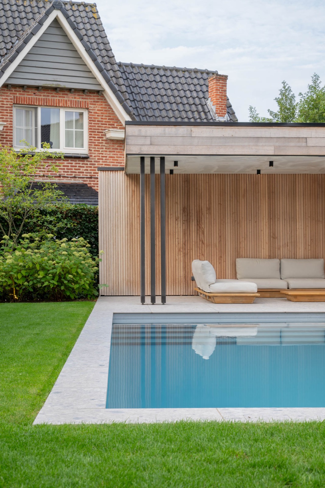 Het zwembad kreeg een lichtgrijze kuip die het water een frisse, azuurblauwe uitstraling geeft. De omlijsting in Ceppo Di Gres keramische tegels zorgt voor een luxueuze finishing touch: stijlvol, onderhoudsvriendelijk en perfect in harmonie met het houten bijgebouw en het groene kader van de tuin.