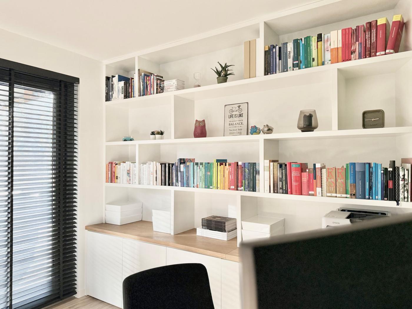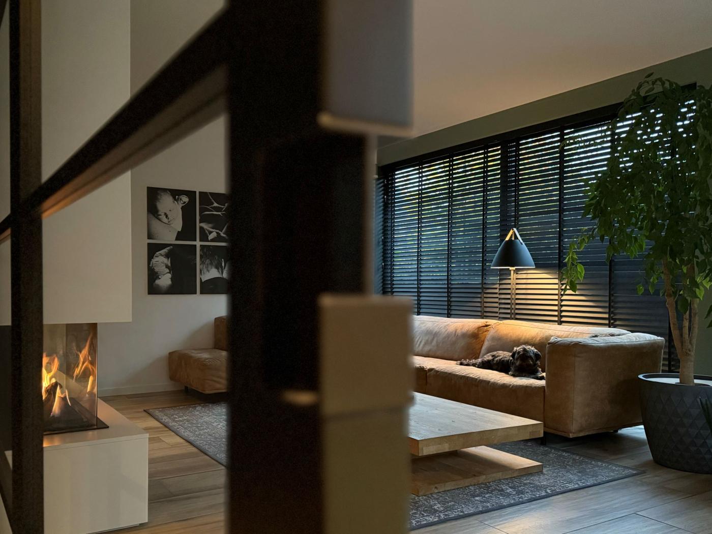 Een uitgebalanceerd samenspel van warme houttinten en strakke lijnen kenmerkt het interieur. De strakke keuken, met een donker houten kastenwand en licht kookeiland, weerspiegelt de rustgevende sereniteit van de badkamer, met het natuurlijke karakter van ruwe steen en eikenhout. De slimme integratie van een boekenkast, bureau en opbergruimte in de werkkamer maximaliseert de ruimte, net zoals het televisiemeubel dat een geheel vormt met de haard en een glazen schuifpui die de ruimte akoestisch kan afscheiden. Bijzondere maatwerk meubels en verlichting completeren het geheel.