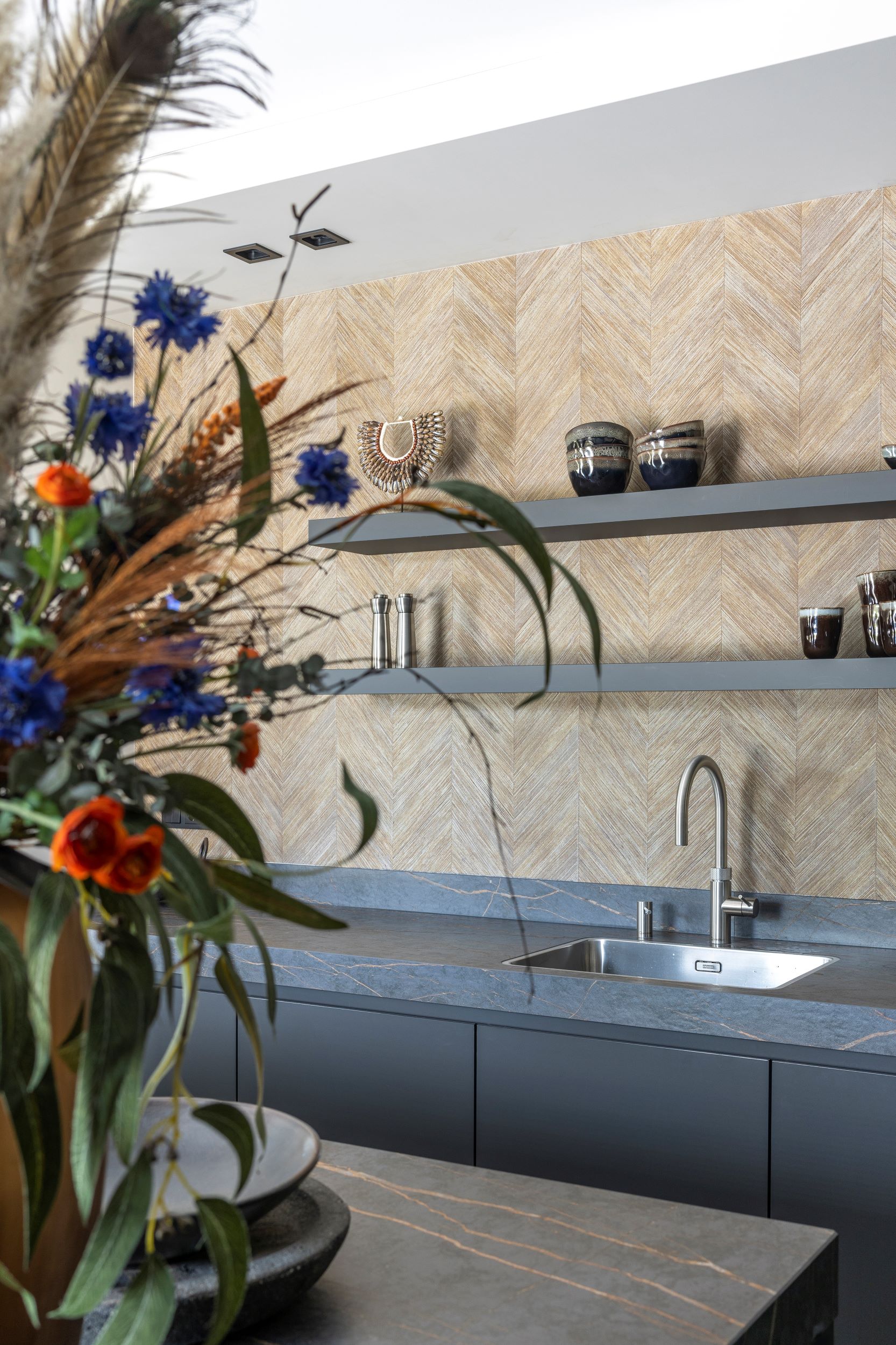 Marjan en Bas woonden eerst honderd meter hier vandaan. “Dat huis had- den we ook zelf gebouwd, maar we waren het na al die jaren een beetje ont- groeid. We worden er niet jonger op en we hadden behoefte aan een woning waar we de mogelijkheid zouden hebben om beneden te slapen. Toen er bij ons om de hoek kavels te koop kwamen, hebben we onze kans gegrepen. In 2019 kochten we een stuk grond en gingen aan de slag om ons ideale huis te bouwen. Ons vorige interieur had een beetje een landelijke sfeer, maar hier wilden we helemaal opnieuw beginnen. Strak en eigentijds moest het worden, maar zeker ook warm.”